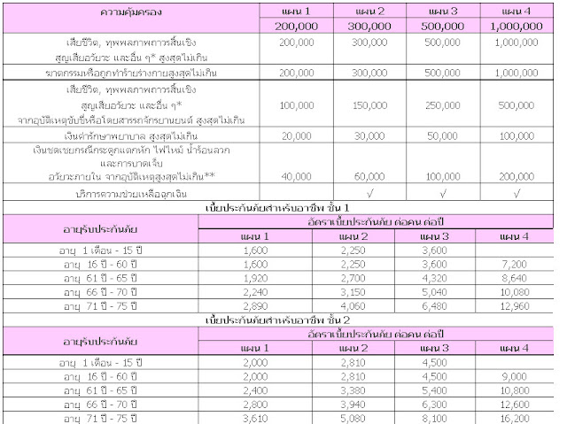 | เงื่อนไขการ พิจารณารับประกันภัย · อัตราเบี้ยประกันภัย : เฉพาะกลุ่มชั้นอาชีพ 1 และชั้นอาชีพ 2 · คุ้มครองอุบัติเหตุตลอด 24 ชั่วโมง ทั่วโลก เป็นระยะเวลา 1 ปี · เกณฑ์อายุที่รับประกันภัยได้ : อายุ 1 เดือน - 75 ปีบริบูรณ์ · สำหรับผู้ทำประกันภัยทุกท่านจะได้รับบัตร Easy P.A. Credit * ผลประโยชน์การสูญเสียอวัยวะ และอื่น ๆ ซึ่งได้แก่ สายตา การรับฟังเสียง การพูดออกเสียง เป็นไปตามอัตราส่วนที่ระบุในกรมธรรม์ ** การจ่ายผลประโยชน์เป็นไปตามเงื่อนไขในกรมธรรม์ หมาย เหตุ กลุ่มอาชีพที่ไม่รับประกันภัย คือ อาชีพงานสนาม เช่น ช่างก่อสร้าง ช่างไม้ กรรมกร รับจ้างทั่วไป ผู้ปฏิบัติงานบนที่สูง ผู้ควบคุมเครื่องจักร นักมวย นักแข่งรถ รถจักรยานยนต์รับจ้าง ฯลฯ ความคุ้มครองบริษัท เมืองไทยประกันชีวิต จำกัด ยินดีมอบความคุ้มครองให้คุณเลือกได้ตามความต้องการจากแผนความคุ้มครอง 4 แผน ที่ให้ความคุ้มครองในกรณีที่ผู้เอาประกันภัยประสบอุบัติเหตุ ดังนี้ 1. คุ้มครองการเสียชีวิต, ทุพพลภาพถาวรสิ้นเชิงภายใน 180 วัน นับแต่วันที่เกิดอุบัติเหตุ, สูญเสียอวัยวะและอื่น ๆ ซึ่งได้แก่ สายตา การรับฟังเสียง การพูดออกเสียง 2. ค่ารักษาพยาบาลต่ออุบัติเหตุแต่ละครั้ง (สูงสุดไม่เกิน 10% ของความคุ้มครองกรณีเสียชีวิต) 3. คุ้มครองภัยฆาตกรรมหรือถูกทำร้ายร่างกาย ตามความคุ้มครองกรณีเสียชีวิต 4. คุ้มครองการเสียชีวิต, ทุพพลภาพถาวรสิ้นเชิงภายใน 180 วัน นับแต่วันที่เกิดอุบัติเหตุ, สูญเสียอวัยวะและอื่น ๆ ซึ่งได้แก่ สายตา การรับฟังเสียง การพูดออกเสียง จากอุบัติเหตุขับขี่ หรือโดยสารรถจักรยานยนต์ จำกัดวงเงินสูงสุดไม่เกิน 500,000 บาท 5. เงินชดเชยกรณีกระดูกแตกหัก ไฟไหม้ น้ำร้อนลวก และการบาดเจ็บอวัยวะภายใน เนื่องจากอุบัติเหตุ 6. บริการให้ความช่วยเหลือฉุกเฉิน (เฉพาะความคุ้ม ครองแผน 2 ถึงแผน 4) 6.1 บริการให้ความช่วยเหลือแพทย์ภายในประเทศ และต่างประเทศ เช่น บริการฉุกเฉินในการเคลื่อนย้ายผู้ป่วย, บริการให้คำแนะนำทางการแพทย์ทางโทรศัพท์, บริการให้ข้อมูลเกี่ยวกับสถานพยาบาล การนัดหมายกับแพทย์ เป็นต้น 6.2 บริการให้ความช่วยเหลือด้านการเดินทางในต่างประเทศ ทั้งก่อนเดินทางและระหว่างเดินทาง เช่น บริการให้ข้อมูลเกี่ยวกับการทำวีซ่าทั่วโลกและวัคซีนที่จำเป็น, บริการช่วยเหลือในกรณีกระเป๋าเดินทาง หรือหนังสือเดินทางสูญหาย และบริการให้ข้อมูลเกี่ยวกับสถานทูต อัตราแลกเปลี่ยน สภาพอากาศทั่วโลก เป็นต้น ข้อยกเว้นความ คุ้มครอง 1. ความสูญเสีย หรือความเสียหายใดๆ อันเกิดจาก หรือสืบเนื่องจากสาเหตุดังต่อไปนี้ 1.1 การกระทำของผู้เอาประก